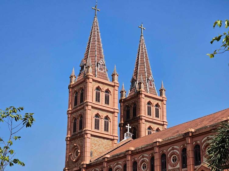 Từ xa, hai tháp chuông cao vút của nhà thờ vươn lên nền trời xanh, như những mũi nhọn hướng thẳng lên không trung, một đặc trưng không thể nhầm lẫn của kiến trúc Gothic. Chính hai tháp chuông này tạo nên "điểm neo thị giác", giúp công trình dễ dàng lọt vào tầm mắt của bất kỳ ai đi qua khu vực.